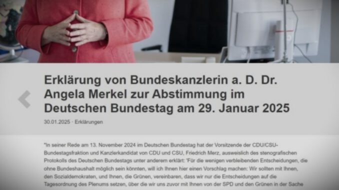 Merz könne es nicht mehr mit seinem Gewissen vereinbaren, nur jene Vorlagen im Parlament zur Abstimmung zu bringen, die vorher die Zustimmung von SPD und Bündnis 90/Die Grünen erfahren haben. Das aber verlangt Bundeskanzlerin a. D. Dr. Angela Merkel und erinnerte Friedrich Merz an ein Versprechen vom 13. November 2024. Damals hatte er Mehrheiten abgelehnt, die durch die AFD zustande kommen.