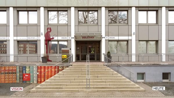 Die Stadt- und Regionalbibliothek Gera wird im Oktober einhundert Jahre alt, und der Förderverein „Buch und Leser“ e. V. feiert im Dezember sein 25-jähriges Bestehen. Eine gemeinsame Aktion soll nun die Jubiläen würdigen. Zurzeit ist der Sockel der Bibliotheksfassade grau und wenig attraktiv. Um das zu ändern, reichte der Verein bei der Crowdfunding-Plattform der Energieversorgung Gera ein Spendenprojekt mit dem Titel „Farbe statt grau – Blickfang Bibliothek Gera“ ein. Das ganze Gebäude soll bildlich auf Bücher gestellt werden (siehe Foto).
