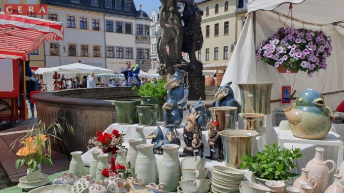 Am 25. und 26. Mai 2024 findet bereits zum 15. Mal der Töpfermarkt auf dem historischen Marktplatz der Stadt Gera und der kleinen Kirchstraße statt. Über 40 regionale und überregionale Keramikkünstler präsentieren ihre handgefertigten Kunstwerke und laden zum Staunen und Kaufen ein. Von Gefäßen für den Garten und Haushalt, Figuren und Plastiken, traditioneller- und Gebrauchskeramik, werden auch moderne und ausgefallene Stücke zu sehen sein. Alle Keramiken sind Unikate und stammen aus den eigenen Werkstätten. Der Töpfermarkt lockt jedes Jahr zahlreiche Besucher aus der Region an und ist ein beliebtes Event für Kunst- und Handwerksliebhaber.