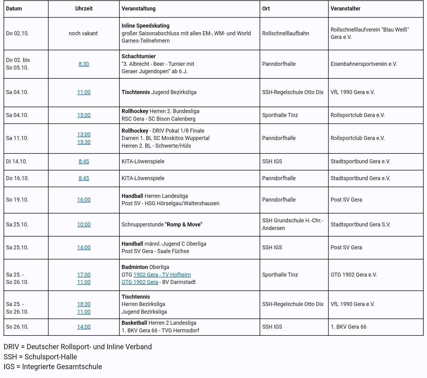 In der nachfolgenden Tabelle, herausgegeben von der Stadtverwaltung, finden Sie die für Oktober in Gera geplanten Sportveranstaltungen. Gespielt wird Schach, Badminton, Tischtennis, Rollhockey, Handball und Basketball. Die Inline-Speedskater haben ihre Saison bereits beendet. Im Hofwiesenbad finden wegen Bauarbeiten bis Jahresende keine Sportveranstaltungen statt.