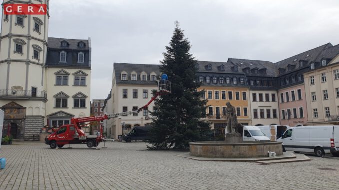 Der Weihnachtsbaum auf dem Marktplatz erhält am heutigen Freitag seine Lichterkette. Sie besteht aus 17’000 Leuchtdioden. Die rund 17 Meter hohe Nordmanntanne stammt aus dem Stadtgebiet und wurde am 12. November aufgestellt. Fällung, Transport und Aufrichtung übernahm auch in diesem Jahr die Firma Tannen-Wulf aus Sömmerda. Eröffnet wird der Weihnachtsmarkt am 27. November 2025 um 10 Uhr; die feierliche Zeremonie mit Laser-Show und Feuerwerk beginnt um 17 Uhr. Im Mittelpunkt steht dieses Jahr das Märchen „Rumpelstilzchen“. Am 20. Dezember ist das Original Nürnberger Christkind aus der Partnerstadt Nürnberg zu Besuch und überbringt zwischen 16 Uhr und 18 Uhr die Weihnachtsbotschaft. Eine Besonderheit in diesem Jahr ist die Pop-Up-Hütte mit täglich wechselnden Angeboten von Händlern, Kunsthandwerkern und Kulturschaffenden aus Gera und der Region.