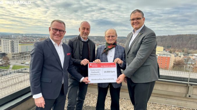 Es ist ein finanzieller Anschub, ohne den ein langjähriges Projekt zum Stillstand gekommen wäre. Mit der Übergabe eines Spendenschecks in Höhe von 10’000 Euro durch Dr. Hendrik Ziegenbein, den Vorstandsvorsitzenden der Sparkasse Gera-Greiz, kann bei der geplanten Rekonstruktion der historischen Marienbrücke im Geraer Stadtwald nun der nächste Schritt gegangen werden. Dr. Hendrik Ziegenbein sagte bei der Scheckübergabe:
