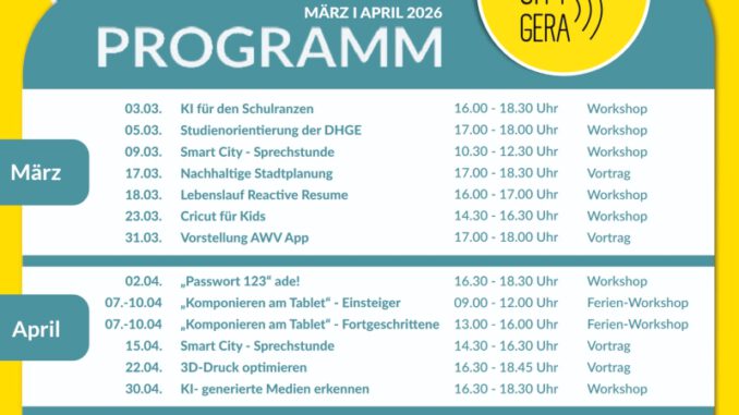 Wegen der begrenzten Teilnehmerzahl wird um eine Anmeldung unter der Rufnummer +4936577347507 oder über „smartcity@gera.de“ gebeten. Das Smartcity-Studio befindet sich im Obergeschoss des Einkaufszentrums Gera-Arcaden. Die Veranstaltungen können unentgeltlich besucht werden. Seit Ende Oktober 2025 ist die Smartcity-Projektgruppe mit einem eigenen Studio im Einkaufszentrum Gera-Arcaden zu finden. Auf der rund 400 Quadratmeter großen Fläche werden unter anderem ein Workshop-Bereich, eine Lounge, ein kleiner Co-Working-Space oder auch zwei Akustik-Kabinen bis zum Ende des Smartcity-Projekts zu finden sein.