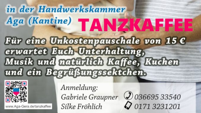 Am Samstag, den 21. März 2026, findet von 14 bis 18 Uhr in der Kantine der Handwerkskammer Aga der dritte Agaer Tanzkaffee statt. Für eine Unkostenpauschale von 15 Euro erwartet die Besucher Unterhaltung, Musik und natürlich Kaffee, Kuchen und ein Begrüßungssektchen. Anmeldungen nehmen Frau Gabriele Graupner unter der Rufnummer 036695 33540 und Frau Silke Fröhlich unter 0171 3231201 entgegen.