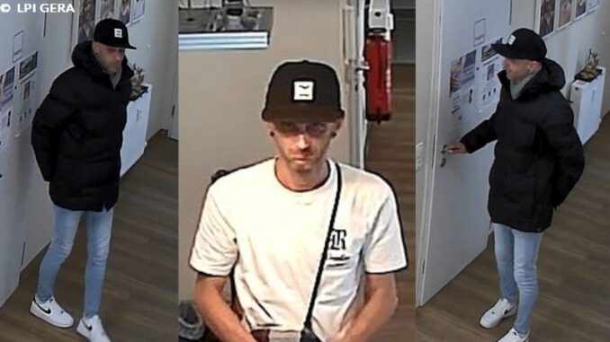 Zwischen dem 15. August 2024, 19 Uhr, und 16. August 2024, 6.40 Uhr, versuchte ein noch unbekannter Mann in die Räume einer Physiotherapiepraxis in der Lasurstraße einzubrechen. Hierbei versuchte er, sowohl die Haupteingangstür der Praxis im Treppenhaus, als auch den Zugang im Hinterhof durch massive Gewalteinwirkung mit einem Hebelwerkzeug zu öffnen und richtete dabei erheblichen Sachschaden an den Türen und den Türzargen an. Ein Eindringen in die Praxisräumlichkeiten gelang dem Unbekannten nicht. Im Rahmen der Ermittlungen konnte die Kriminalpolizei Videomaterial sichern und einen dringenden Tatverdacht gegen den Mann auf nachfolgenden Bildern verdichten. Wer kann Angaben zur Identität der abgebildeten Person machen? Hinweise nimmt die Kriminalpolizei unter der Rufnummer +49365 82341465 zum Aktenzeichen 0212120/2024 entgegen.