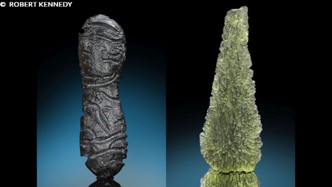 In der neuen Ausstellung sind Tektite aus zwei Tektit-Streufeldern zu sehen. Eines davon ist das Europäische Streufeld, das sich vor allem über Teile der Tschechischen Republik erstreckt. Das entsprechende Impaktereignis ist heute noch gut in Deutschland zu erkennen. Der Ries-Krater bei Nördlingen zeugt von einem katastrophalen Meteoriteneinschlag vor zirka 15 Millionen Jahren mitten im Gebiet des heutigen Deutschlands. Die Tektite, die dabei entstanden, werden als Moldavit bezeichnet. Ihre oft fantastisch grüne Farbe macht sie besonders populär und begehrt. Durch die Moldau und nachfolgend die Elbe wurden Moldavite aus ihrem ursprünglichen Streufeld abtransportiert und lagerten sich in Sanden und Kiesen der Elbe im heutigen Sachsen und Brandenburg ab, wo sie als sehr seltene „deutsche“ Moldavite in Kiesgruben gefunden werden können. In der Ausstellung erwartet die Besucher und Besucherinnen eine Auswahl filigraner Moldavite aus der Tschechischen Republik, aber auch jener sehr seltenen Exemplare aus Sachsen.